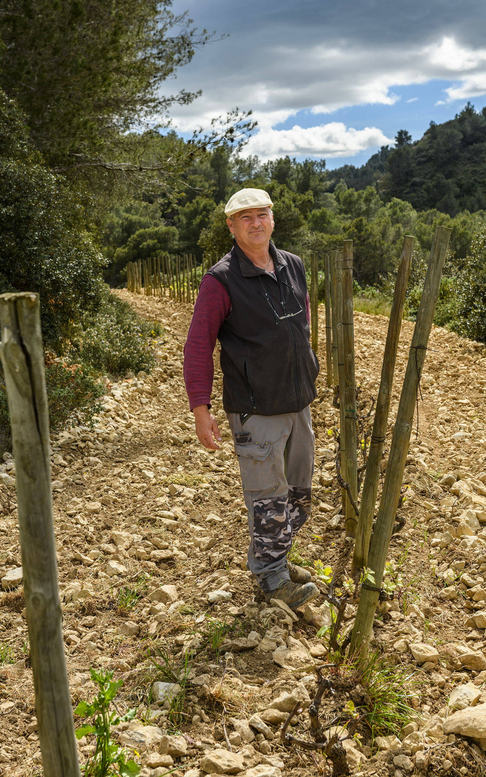 Aujourd’hui, une quinzaine d’hectares de vignes, issues uniquement de sélections massales, sont cultivés sur plus de quarante parcelles, toutes cernées de garrigues, de pins, et d’oliviers.
